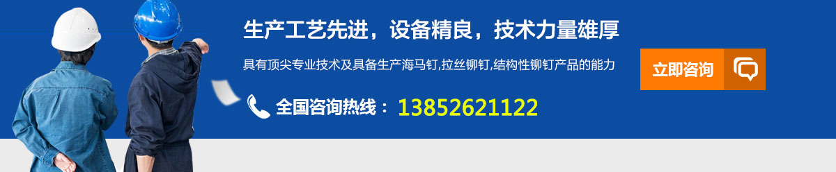 靖江市赛德隆紧固件制造有限公司是专业生产海马钉、拉丝铆钉、结构性铆钉厂家。具有专业技术及具备生产海马钉、拉丝铆钉、结构性铆钉产品的能力。公司本着“质量保证,服务满意”的精神,秉乘“科技创新、以人为本”的宗旨。以“质量是生命、诚信为灵魂”的经营理念。始终如一地与海内外新朋旧友精诚合作,提供优良的服务,让赛德隆紧固件成为您事业成功的忠实伙伴。